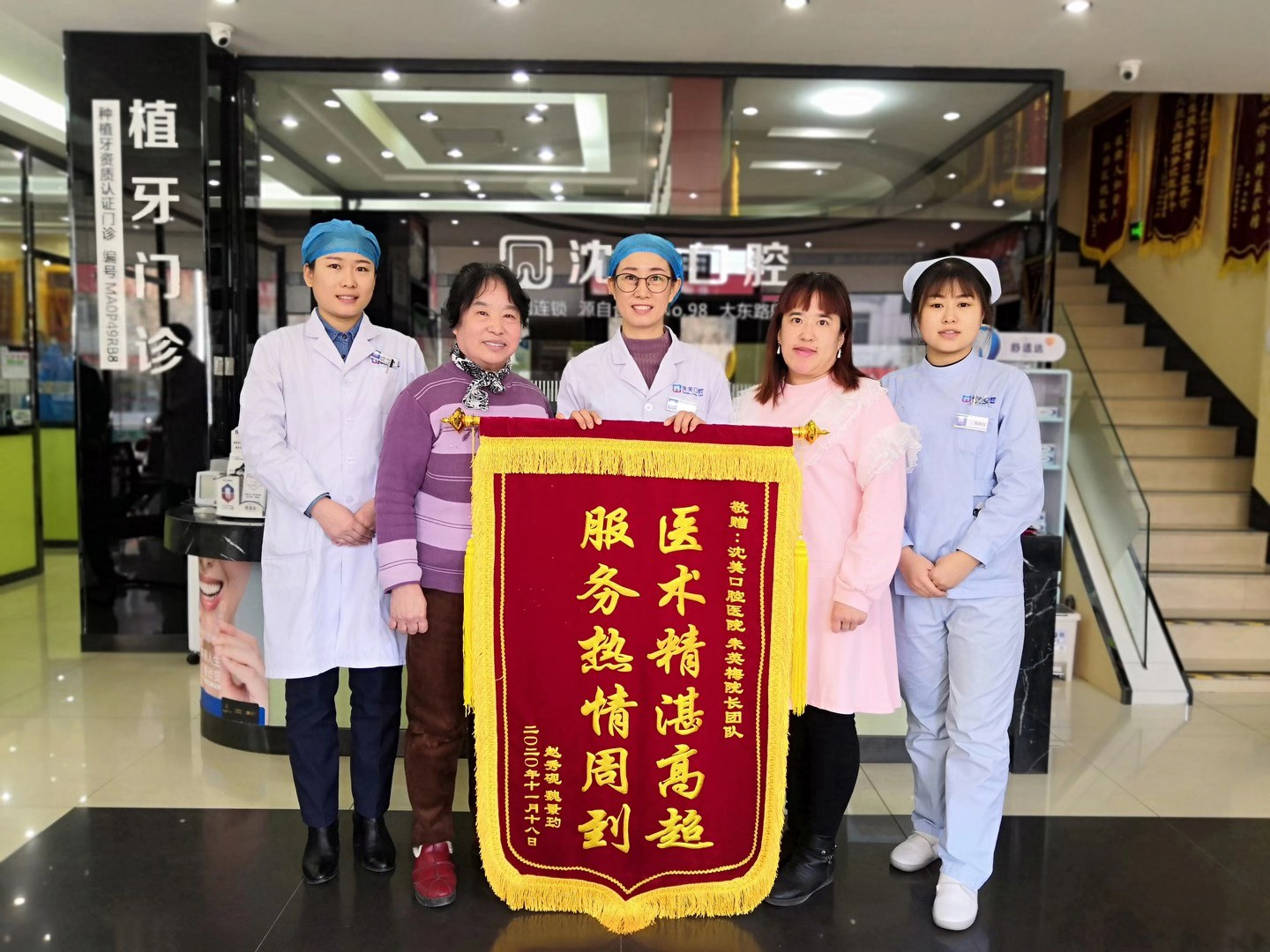 2020年11月18日沈美口腔东顺城门诊部朱英梅院长团队获得患者赵秀砚 魏景玓赠送锦旗——“医师精湛高超,服务热情周到”