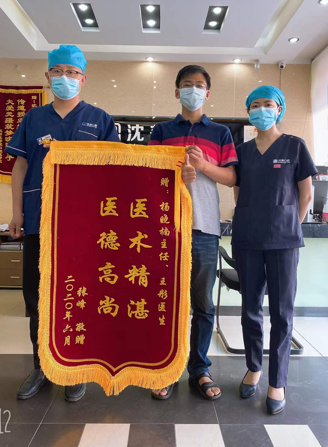 2020年6月19日沈美口腔老瓜堡门诊部杨晓楠主任获得张峰患者赠送锦旗——“医术精湛,医德高尚”