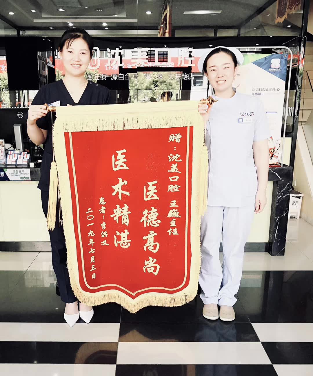 2019年7月3日沈美口腔东顺城门诊部王巍主任获得李洪义患者赠送锦旗——“医德高尚,医术精湛”