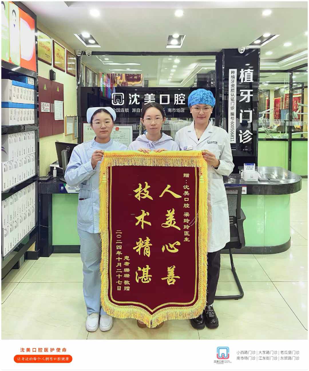 2024年10月30日沈美口腔南市场门诊部梁玲玲医生获得珊珊患者赠送锦旗——“人美心善 技术精湛”。