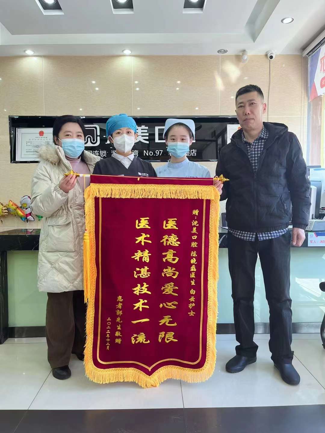 2022年12月3日沈美口腔老瓜堡门诊部陈晓磊医生、白雲护士获得患者郭先生赠送锦旗——“医德高尚爱心无限,医术精湛技术一流”