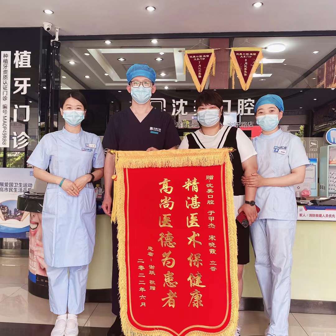 2022年6月24日沈美口腔东顺城门诊部于甲杰医生、宋晓霞护士、立香护士长获得谢跃患者赠送锦旗——“精湛医术保健康,高尚医德为患者”